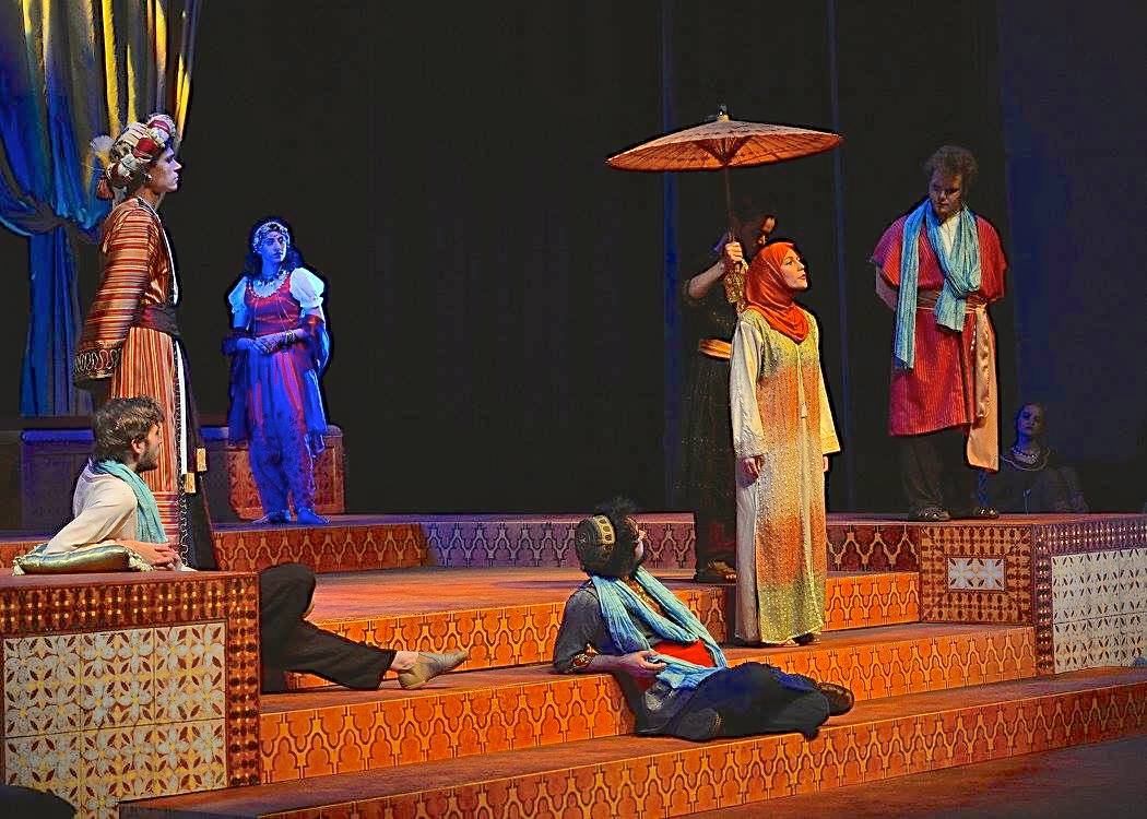 For The Arabian Nights my assistant director, who was also serving as house manager, was more diligent than ever about urging the ushers to remind every single patron to turn off their phones. They apparently did this very reliably, but I noticed two things as I overheard their interactions with arriving patrons. First, most of the student ushers seemed sheepish, as if tacitly apologizing for the request they were making; perhaps without realizing it they felt worried about coming off as bossy or un-cool with their peers and/or impertinent or disrespectful of their elders. Also, upon reflection, I concluded that we were not requesting the right thing: when we asked audience members to turn off their phones as they arrived, they may have been thinking, “I’ll put it on silent mode,” or even “I’ll turn it off for now,” but what we really want is for them to leave their phones off and in their pockets–not just silenced but with the screens dark–until intermission and again until after the final curtain.